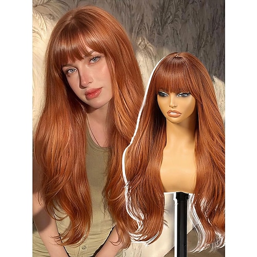 Parrucca castana con mèches bionde e frangia, parrucca castana a strati per donna, parrucche lunghe e ondulate, parrucca sintetica per feste, uso quotidiano, 26 pollici