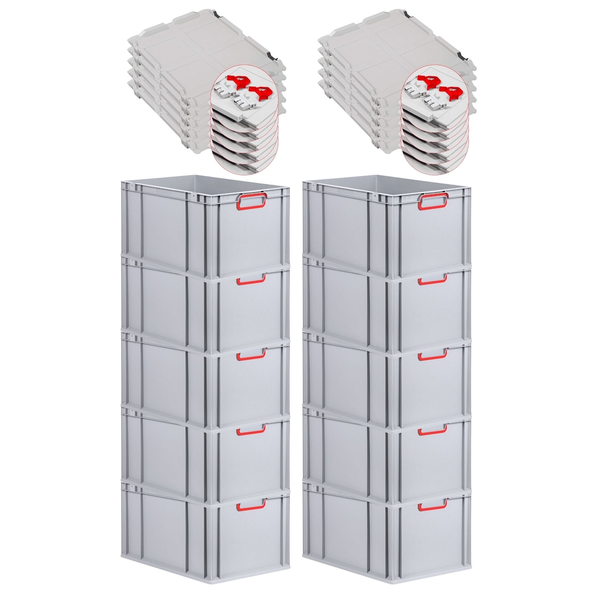PROREGAL 10x Eurobox NextGen Color mit Scharnierdeckel & Verschlüssen | HxBxT 22x40x60cm | 65 Liter | Griffe rot geschlossen | Verstärkter Boden