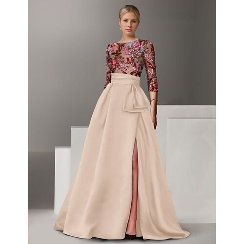 Abito da Sera A-Line Ricamato Floreale Elegante Formale Matrimonio Lungo Fino al Pavimento Mezza Manica Collo a Camicia di Satin con Fiocco(e) Spacco