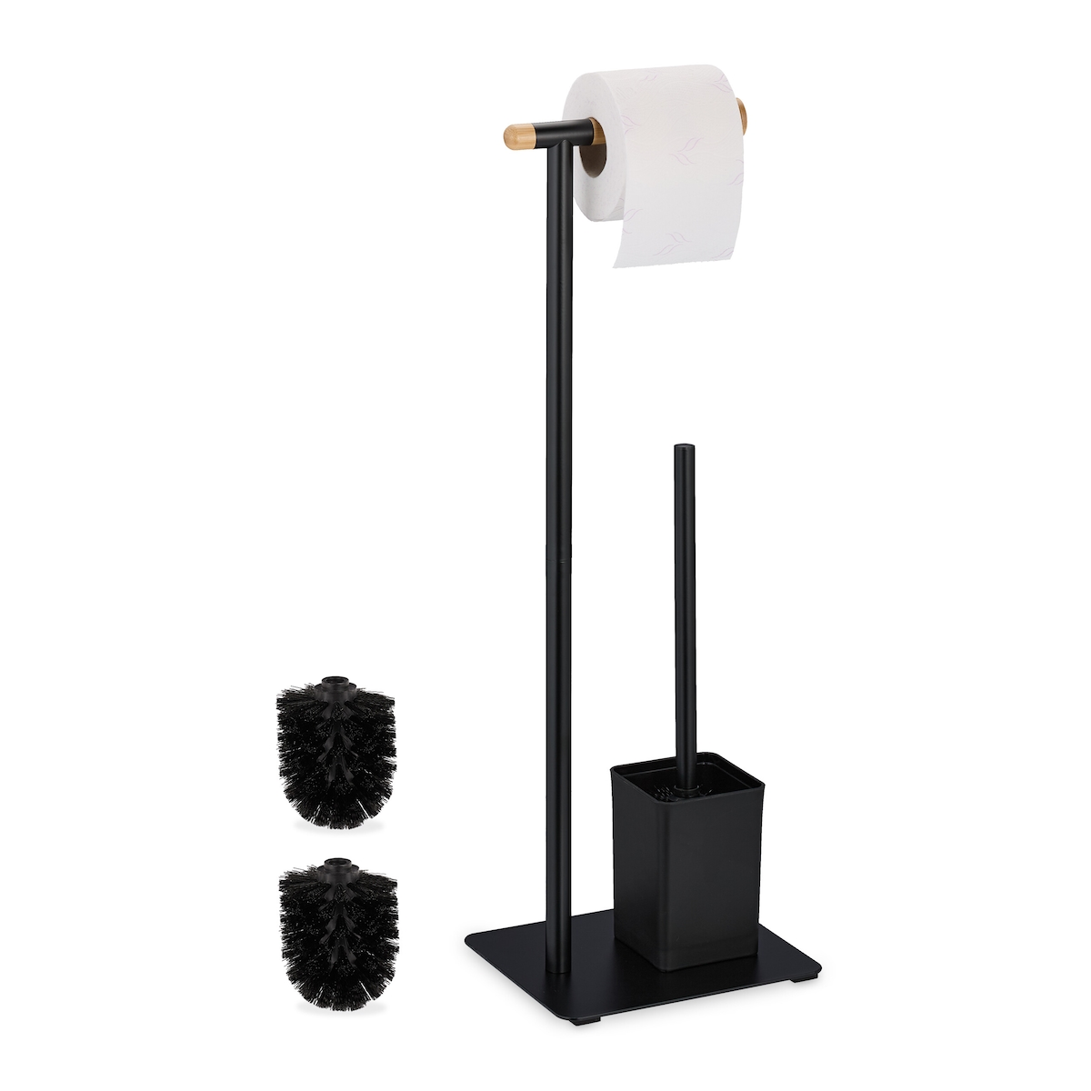 Relaxdays WC Garnitur, Bambus, Edelstahl, stehender Klopapierhalter, Toilettenbürste mit Bürstenhalter, schwarz/natur