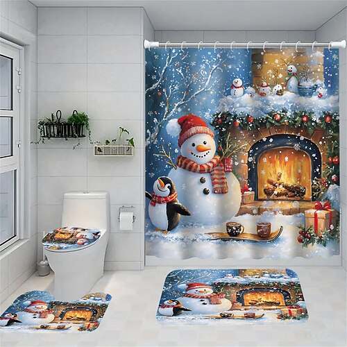 tenda da doccia in quattro pezzi, con sedile WC antiscivolo e robusto e tappetino da bagno – motivo a fiocco di neve con albero di Natale e pupazzo di neve, materiale in poliestere impermeabile con 12