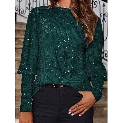 Natale Per donna Blusa Tinta unica Elegante Casual Manica Lunga Girocollo Top Regolari Quotidiano Paillettes Rosso Blu Fucsia Verde Primavera Autunno Inverno