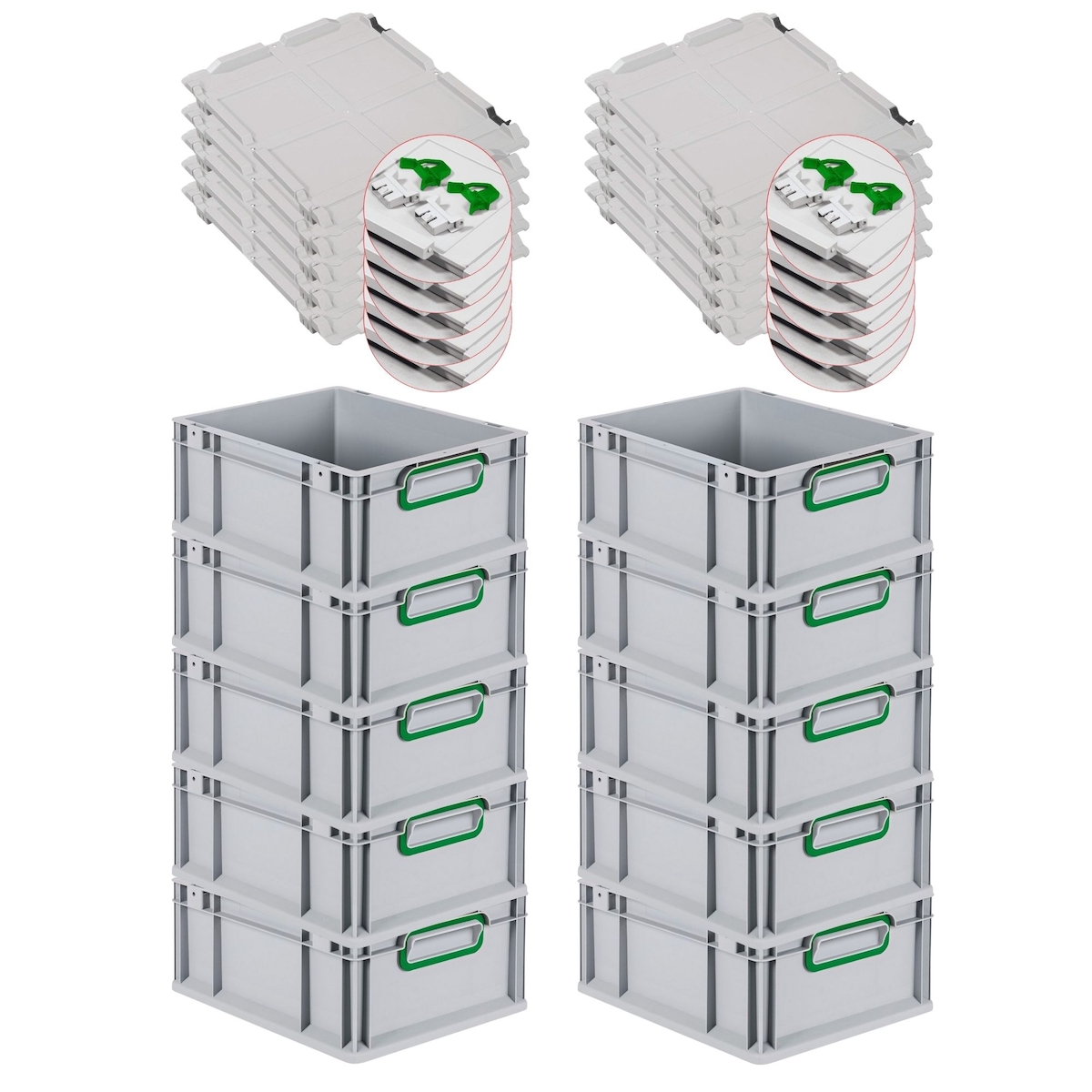 PROREGAL 10x Eurobox NextGen Color mit Scharnierdeckel & Verschlüssen | HxBxT 17x30x40cm | 16 Liter | Griffe grün geschlossen | Glatter Boden