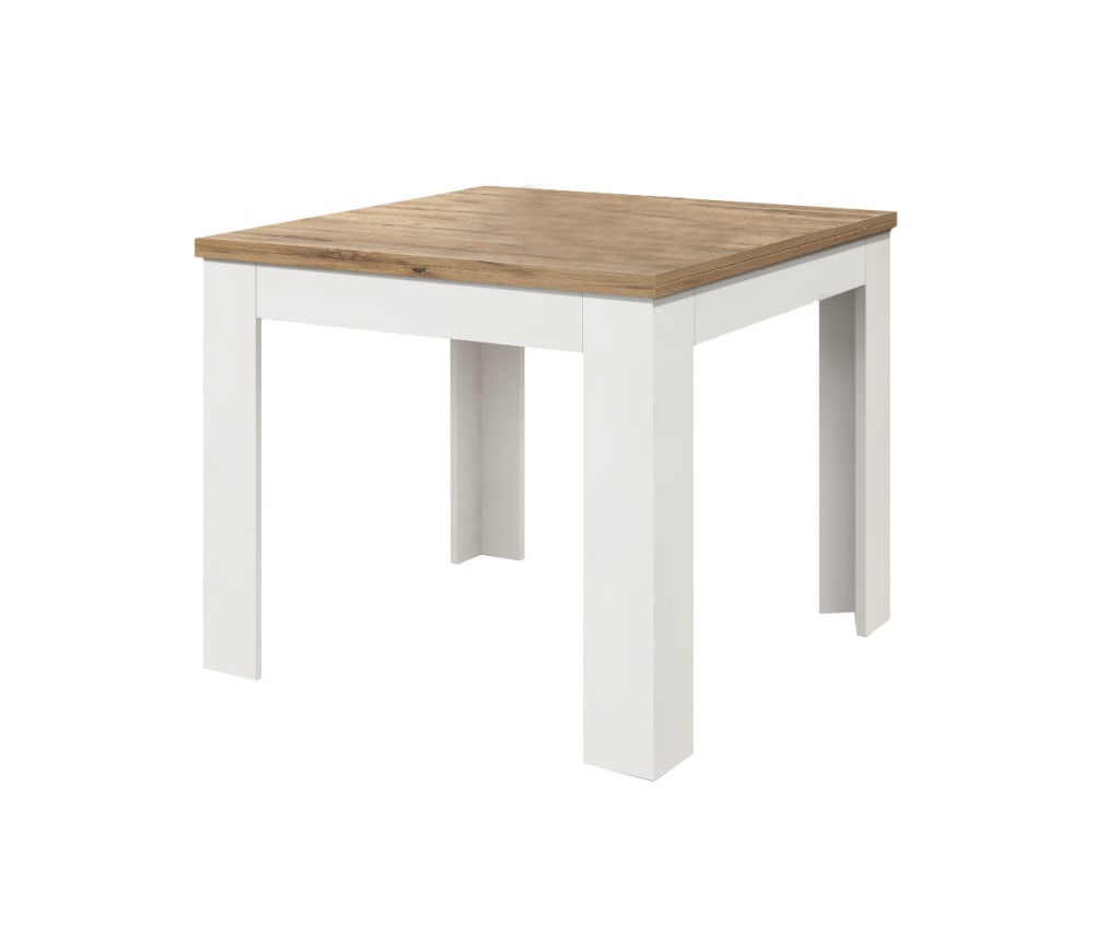Table en bois finition chêne, base extensible blanche 90×90-180×90cm