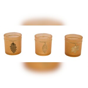 Glaswindlicht, mit Blattanhänger, orange, 3 Stück, Ø 7 cm / Höhe: 8 cm, handgefertigt, *Germany*