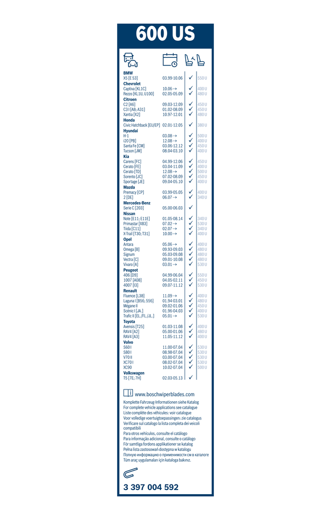BOSCH Wischblatt Twin 3 397 004 592 Bügelwischblatt mit Spoiler für SAAB MITSUBISHI TOYOTA NISSAN VW LANCIA CITROEN RENAULT OPEL MAZDA KIA FORD USA PE
