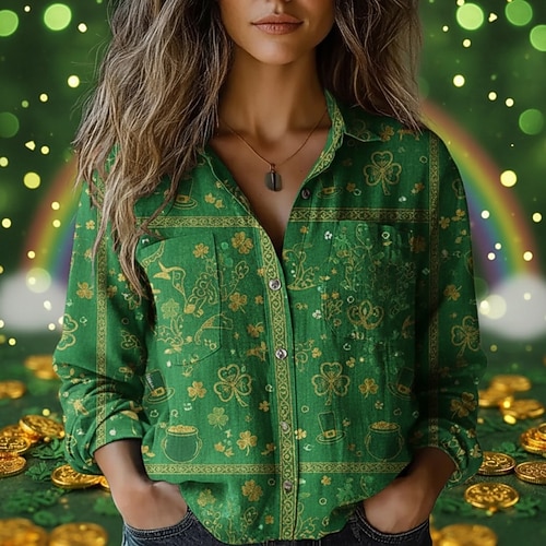 Festa di San Patrizio Per donna Camicia Camicia Boho Trifoglio Vintage Elegante Etnico Manica Lunga Colletto a Camicia Top Regolari Quotidiano Ferie Uscire Bottoni Stampato Verde primavera Verde