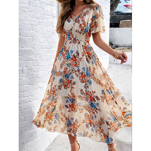 Per donna Abito maxi Abito a trapezio Casual All'aperto Uscire Vestibilità standard Floreale Manica Corta Scollo a V Blu blu navy Nero Albicocca Estate Primavera