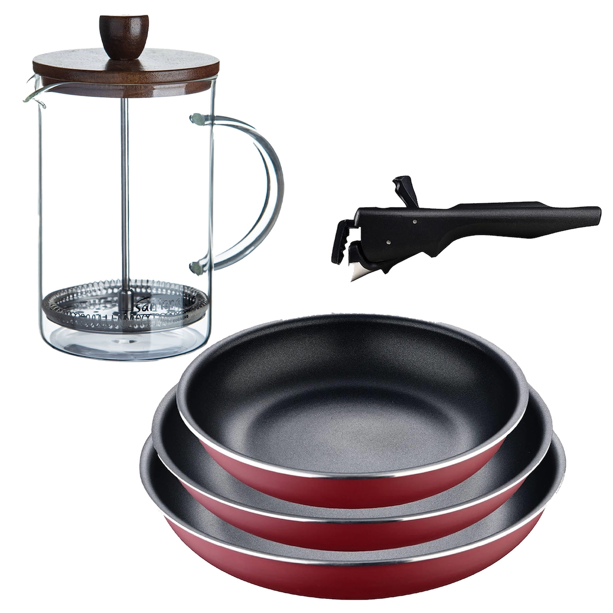 BERGNER - Set mit 3 Bratpfannen Ø18/20/24cm aus gepresstem Aluminium, rot, mit abnehmbarem Griff mit Stempel-Kaffeemaschine aus Borosilikatglas
