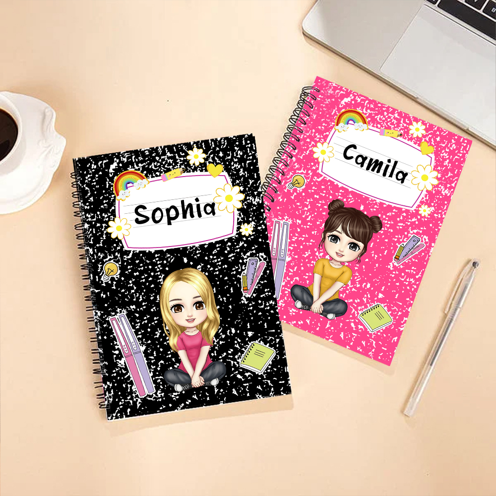Personalisierte niedlichen Cartoon Student Charakter Multi-Color A5 Spiral Notebook mit Namen Geburtstag zurück zu Schule Geschenk für Kinder Studenten