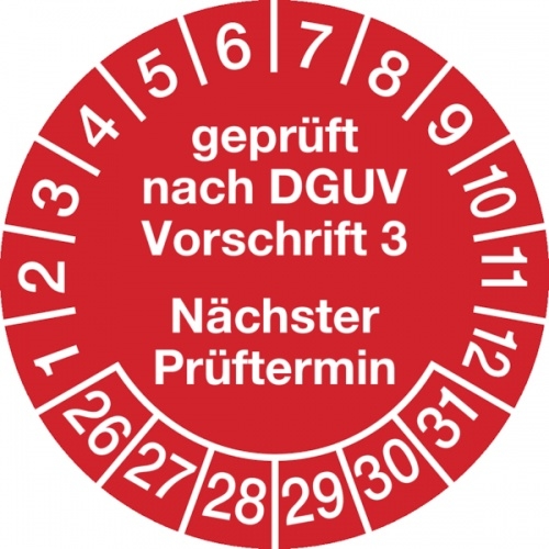 König Werbeanlagen Prüfplakette ab 26, DGUV Vorschrift 3 Nächster Prüftermin, rot/weiß, Folie, Ø 30mm - Bogen = 10 Plaketten - 30 mm Folie selbstklebend