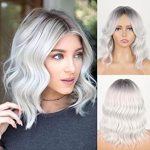 parrucca corta ondulata con frangia a tendina, parrucca corta ondulata con radici scure, parrucche bob per donne, parrucca bob ondulata dall'aspetto naturale con frangia