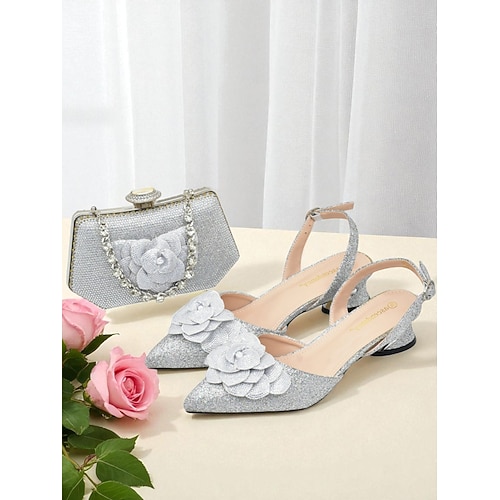 set di scarpe con tacco slingback glitterate da donna e pochette da sera abbinata con motivo floreale 3D per eventi formali e cocktail party