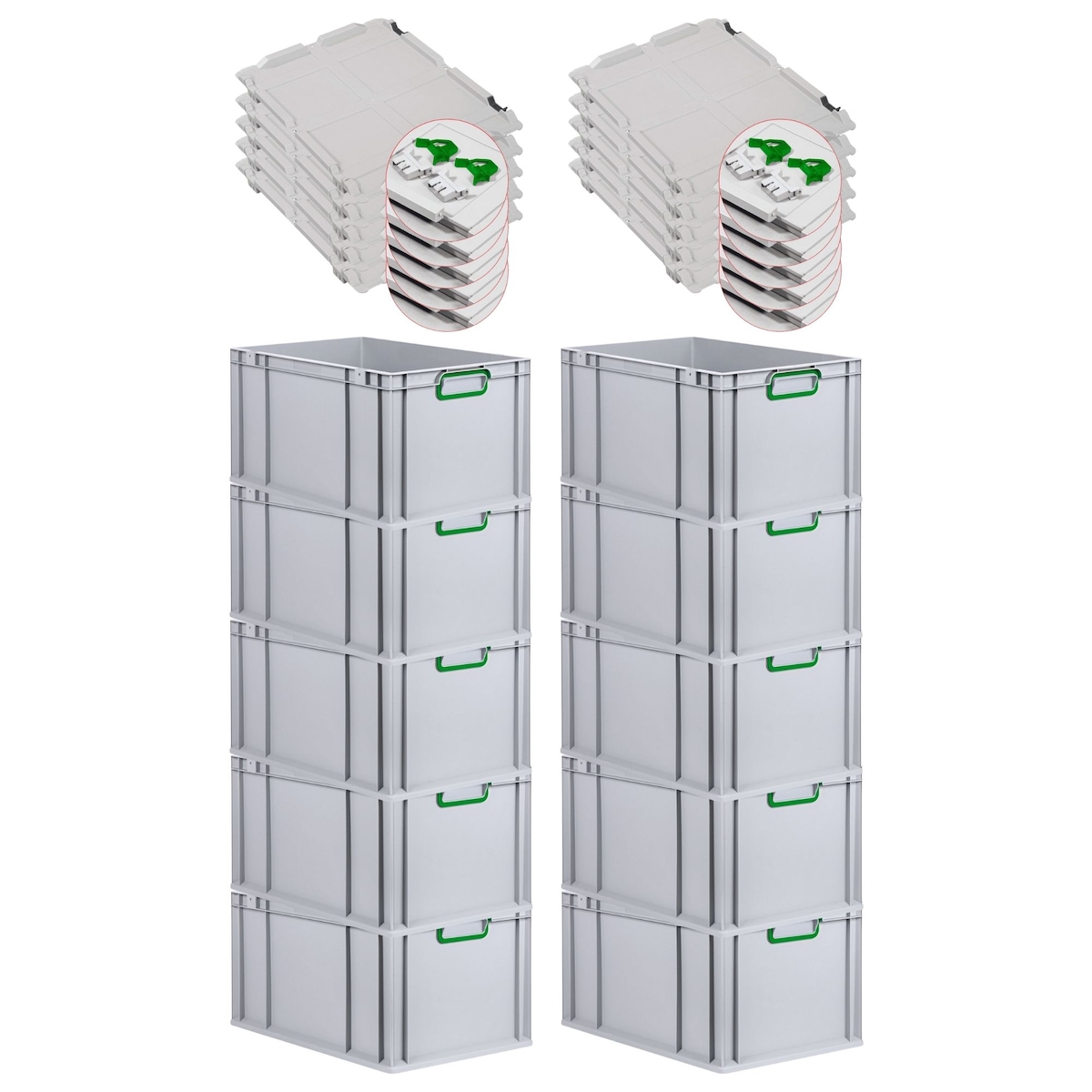 PROREGAL 10x Eurobox NextGen Color mit Scharnierdeckel & Verschlüssen | HxBxT 22x40x60cm | 65 Liter | Griffe grün geschlossen | Verstärkter Boden