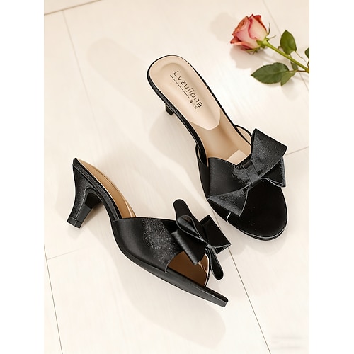 pantofole da donna in raso rosa con fiocco oversize e punta aperta: eleganti pantofole con tacco per San Valentino, appuntamenti romantici e occasioni speciali
