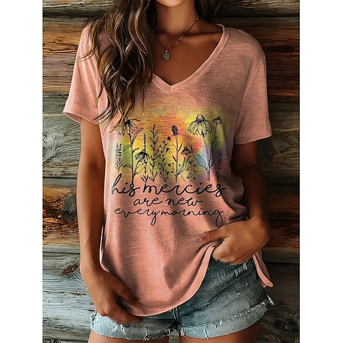 Per donna Maglietta Grafico Piante Lettera Vintage Elegante Casual Manica Corta Scollo a V Top Regolari Quotidiano Stampato Rosa Estate Primavera