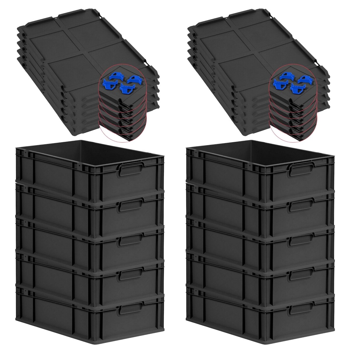 PROREGAL 10x Eurobox NextGen Grip mit Scharnierdeckel & blauen Verschlüssen | HxBxT 32x40x60cm | 65 Liter | Griffe geschlossen | Verstärkter Boden