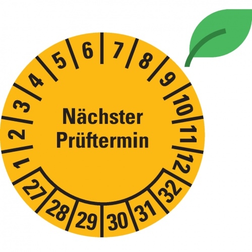 Dreifke® Prüfplakette Nächster Prüftermin 27-32,gelb,ökologische Folie,Ø 30mm,18 St/Bogen