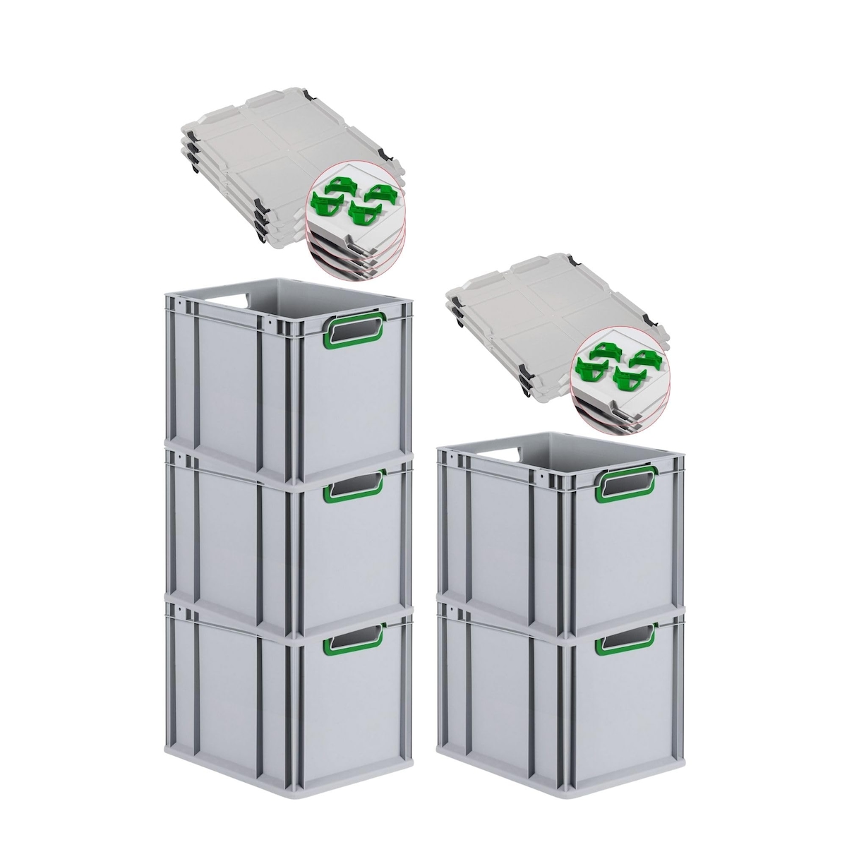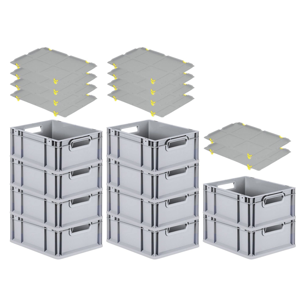 PROREGAL SparSet 10x Eurobox NextGen Economy mit Auflagedeckel & 4x Verschlüsse Gelb, Griffe offen, HxBxT 17x30x40cm, 16L, Eurobehälter, Box