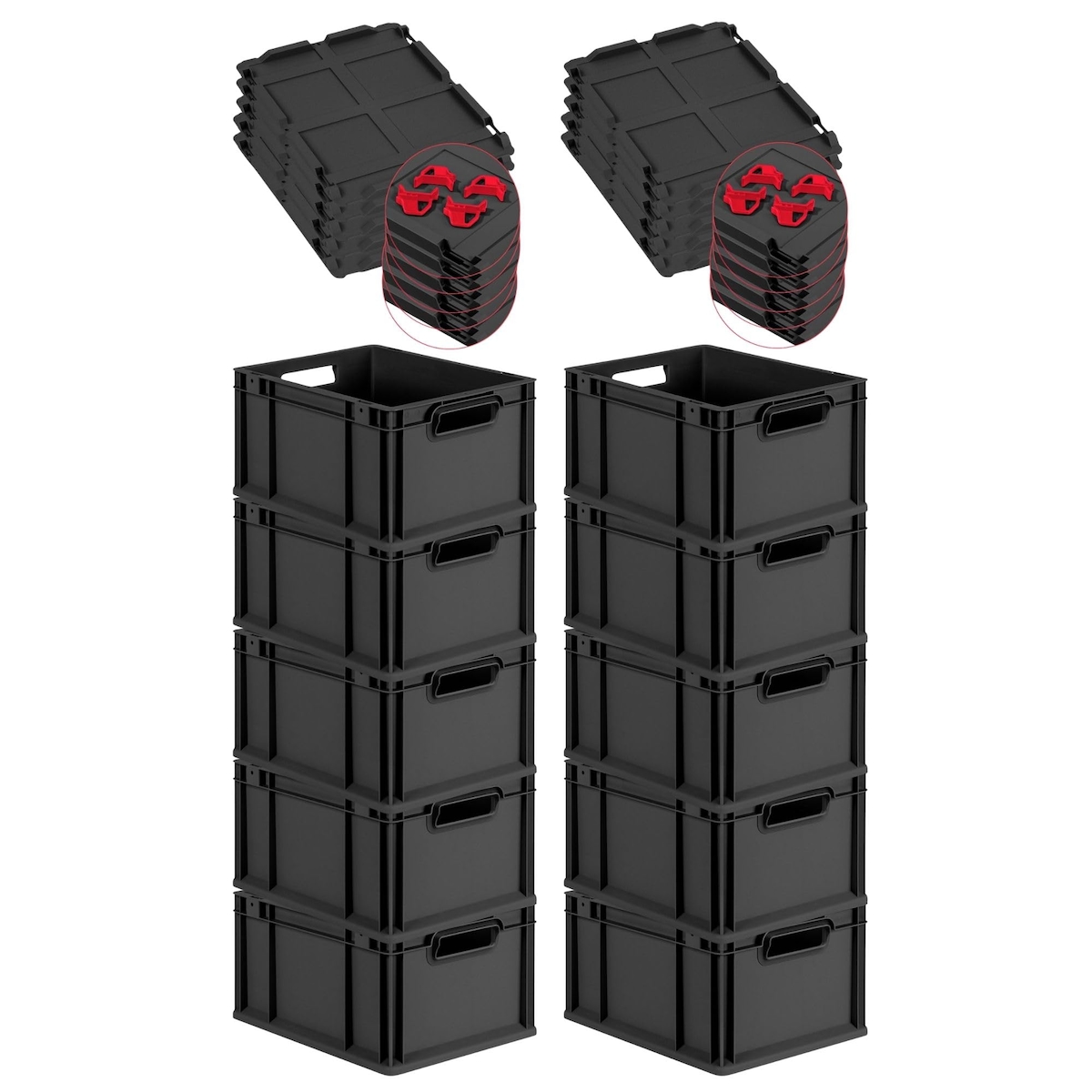 PROREGAL SparSet 10x Eurobox NextGen Grip mit Auflagedeckel & 4 roten Verschlüssen, HxBxT 22x30x40cm, 20L, Schwarz, Griffe offen, Eurobehälter