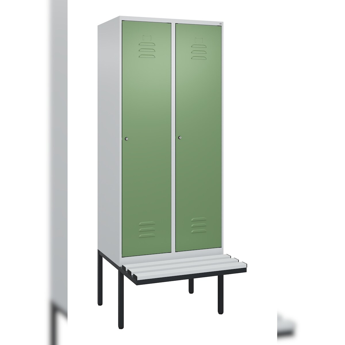 C+P Spind Classic PLUS, Kunststoff schwebende Sitzbank, 2 Abteile, HxBxT 212x80x82cm, Zylinderschloss, Hellgrau/Resedagrün von PROREGAL