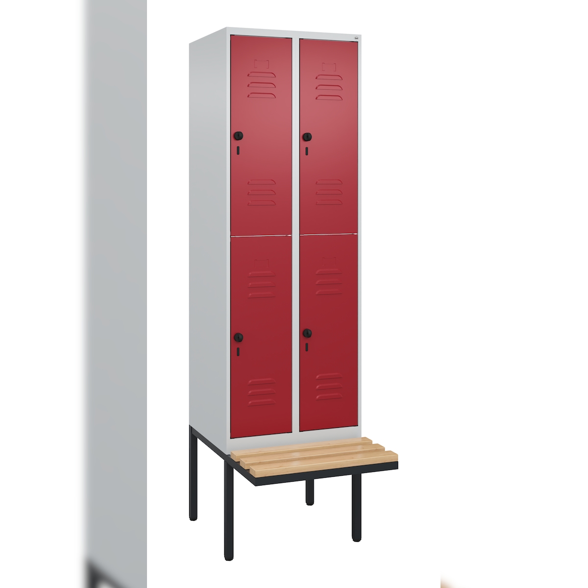 C+P Spind Classic PLUS, Buche schwebende Sitzbank, 4 Abteile, HxBxT 212x60x82cm, Sicherheitsdrehriegel, Hellgrau/Rubinrot von PROREGAL