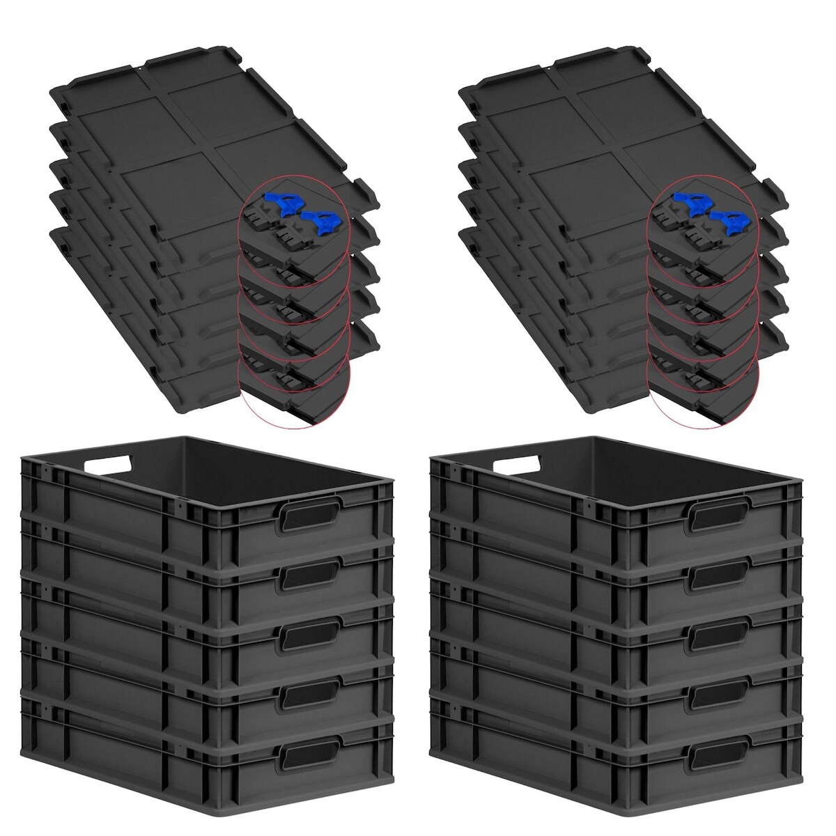 PROREGAL SuperSparSet 10x Eurobox NextGen Economy mit Scharnierdeckel & schwarzen Verschlüssen, Griffe offen, HxBxT 22x40x60cm, 44L, Eurobehälter, Box