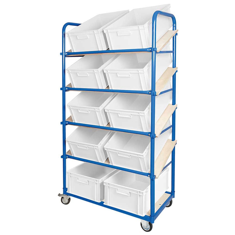 BRB Schrägboden-Regalwagen mit 5 Ebenen, mit 10 Euroboxen 600x400x220 mm weiß