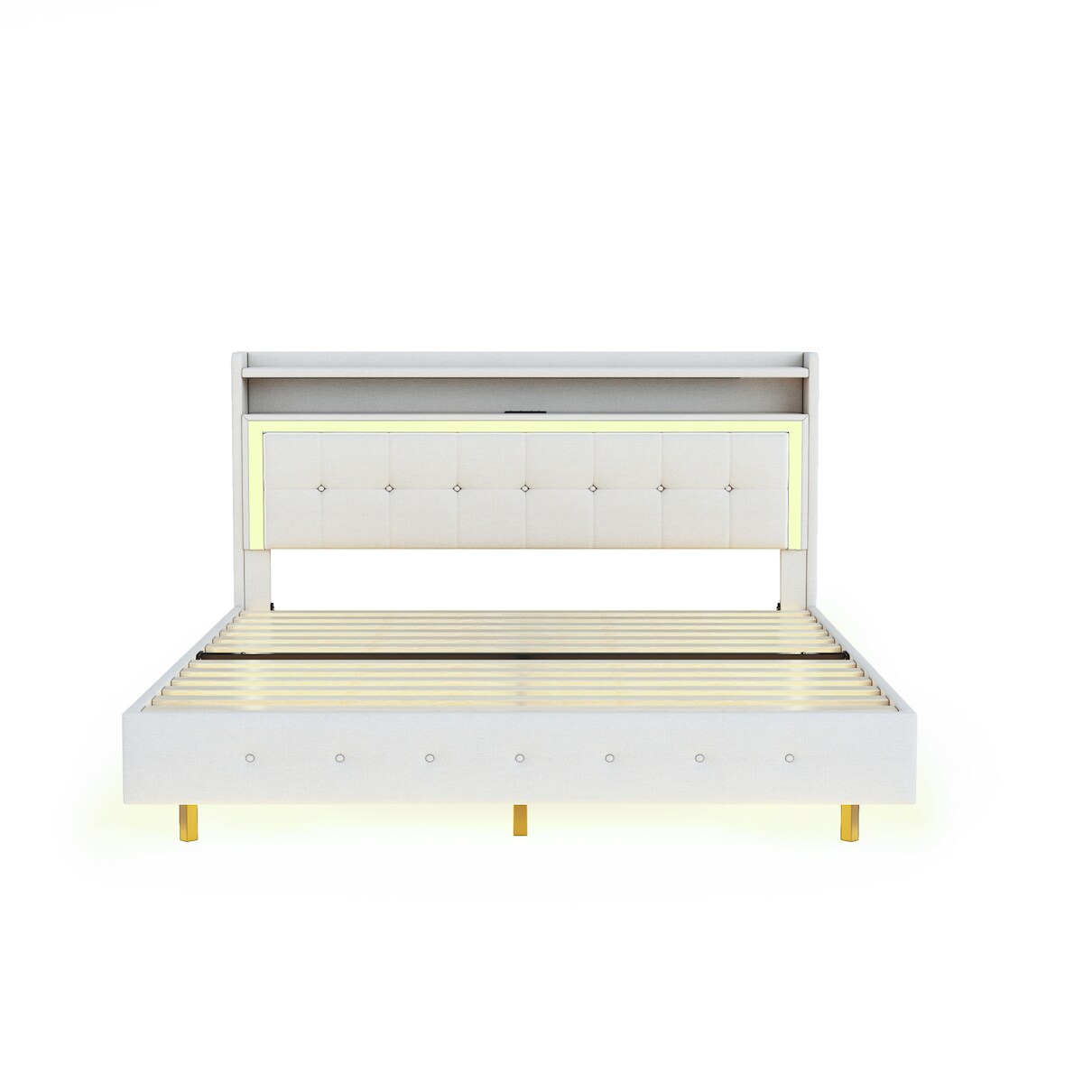 Merax Polsterbett 140*200, mit USB-Steckdose und LED-Licht, verstecktes Fußdesign, Doppelflachbett, Leinenstoff beige