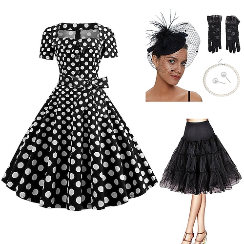 set con abito a trapezio sottoveste sotto la gonna cappello fascinator guanti di pizzo orecchini collana pois da donna abito da cocktail anni '50 costume da festa vintage abito svasato abiti da tea