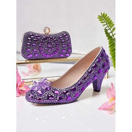 set da donna con tacchi e pochette in strass e decorazioni in cristallo multicolore: eleganti scarpe e borsa abbinate per eventi formali e cocktail party
