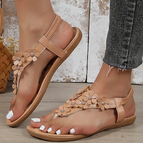 sandali da donna con cinturino a T decorato con fiori e suola ammortizzata, perfetti per le uscite estive casual