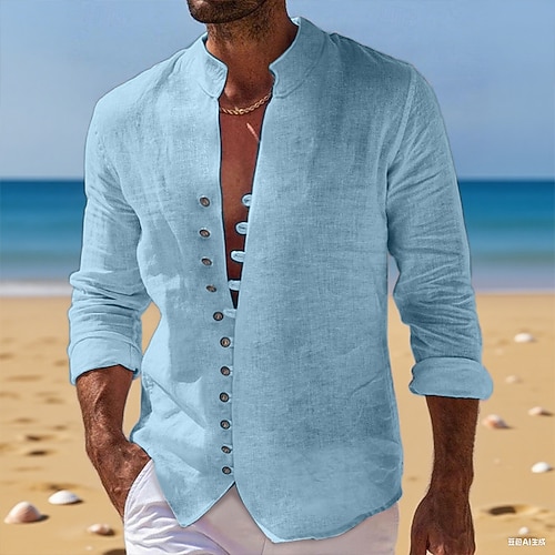 100% lino Per uomo camicia di lino Camicia Camicia con bottoni Camicia da spiaggia Giallo Blu marino Verde Manica lunga Liscio Colletto alla coreana Primavera Autunno Esterno Giornaliero