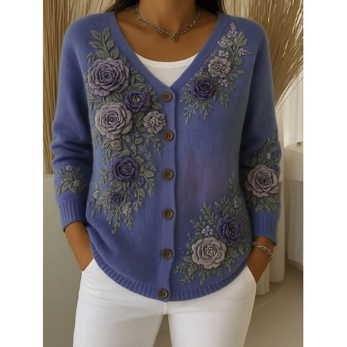 Per donna Maglietta Floreale Grafico Piante Vintage Elegante Classico Manica Lunga Scollo a V Top Regolari Quotidiano Ricamato Stampato Bianco Primavera Autunno Inverno