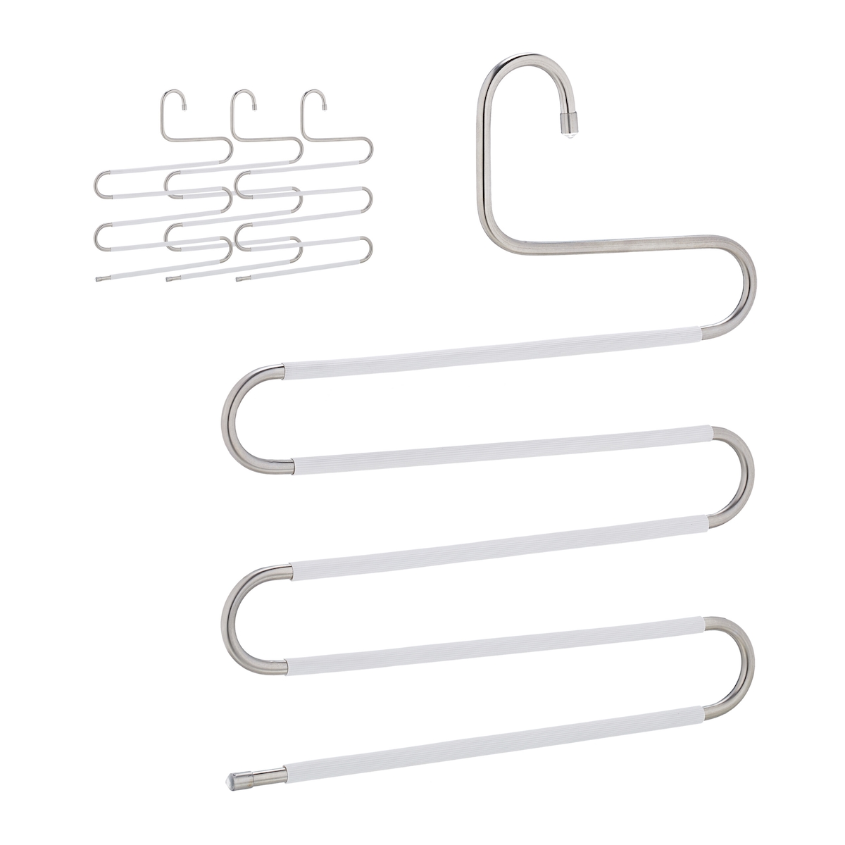 Relaxdays Mehrfach Hosenbügel, 4er Set, S-Form, 5 Stangen, rutschfest, platzsparende Multibügel, Metall, silber/weiß
