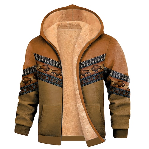 Per uomo Tribale Pile Felpa con Cappuccio Giacca di pelle Felpa Etnico Classico Cowboy Western Girocollo All'aperto Viaggio Abbigliamento casual alla moda Campeggio Blu Marrone Con zip Autunno Inverno