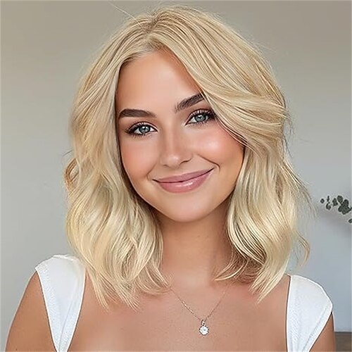 Parrucche da donna con mèches color caramello da 14 pollici - parrucca ondulata lunga fino alle spalle con attaccatura dei capelli in pizzo pretagliata, riga centrale, caschetto ondulato naturale,