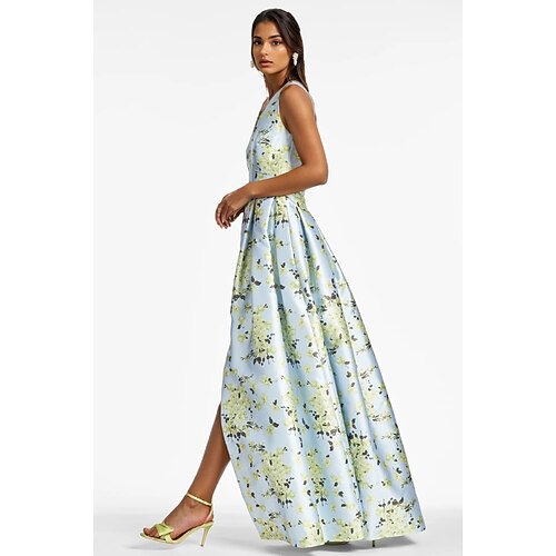 Abito da Sera A-Line con Spacco Alto Abito da Matrimonio Formale Ospite di Matrimonio Lungo Senza Maniche Collo a V Pocket Satin con Stampa Floreale Spacco Pocket Vestito da Gara Ospite di Matrimonio