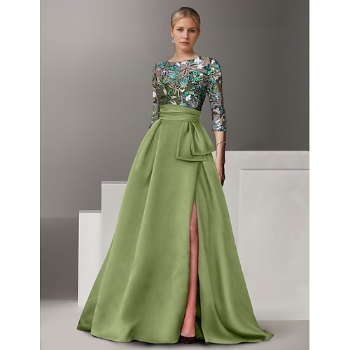 Abito da Sera A-Line Ricamato Floreale Elegante Formale Matrimonio Lungo Fino al Pavimento Mezza Manica Collo a Camicia di Satin con Fiocco(e) Spacco