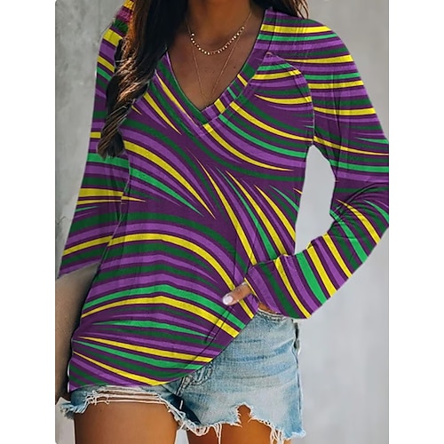 Martedì grasso Per donna Maglietta Grafico Geometrico Sfumatura Elegante Classico Casual Manica Lunga Scollo a V Top Regolari Quotidiano Uscire Weekend Stampato Giallo Viola Verde Estate Primavera