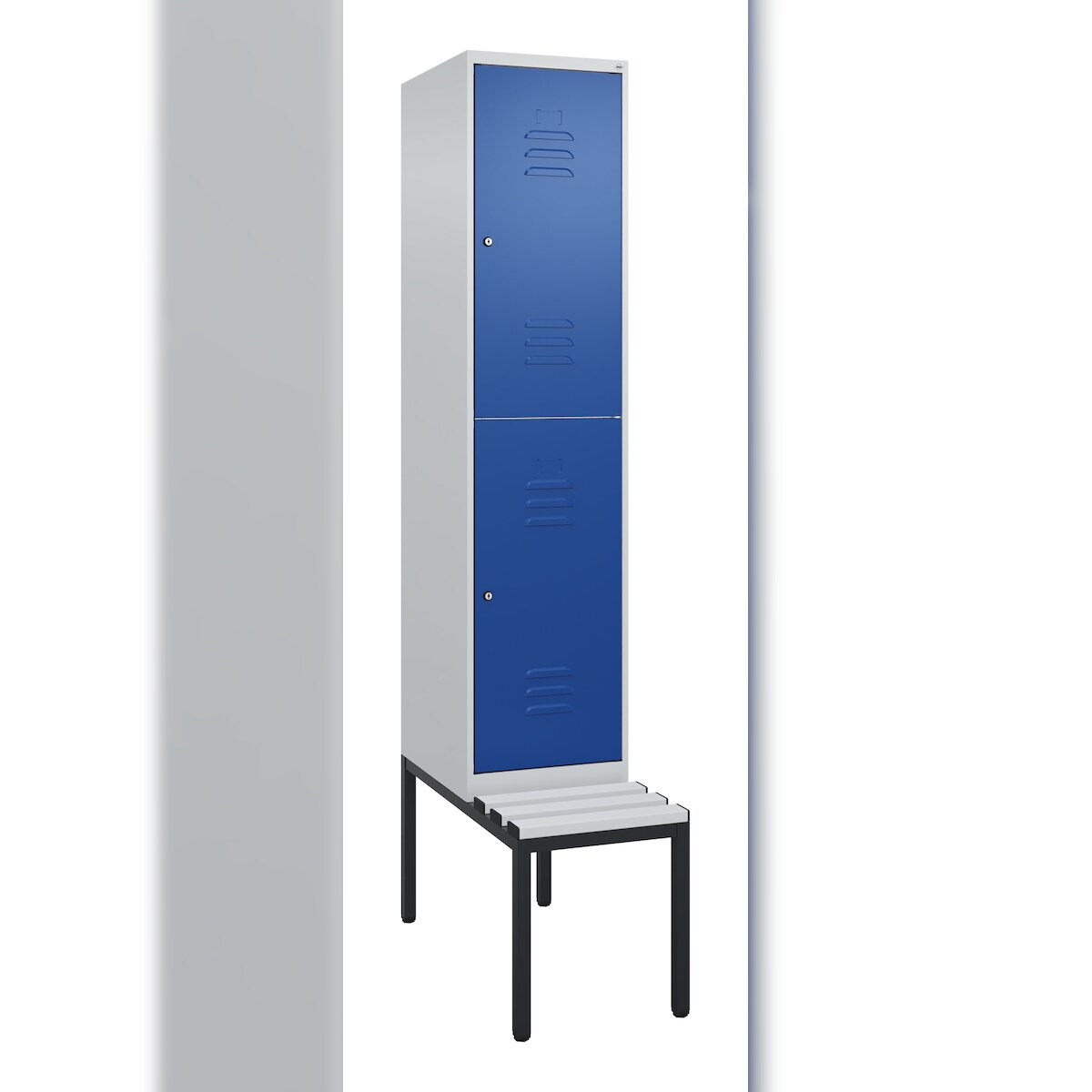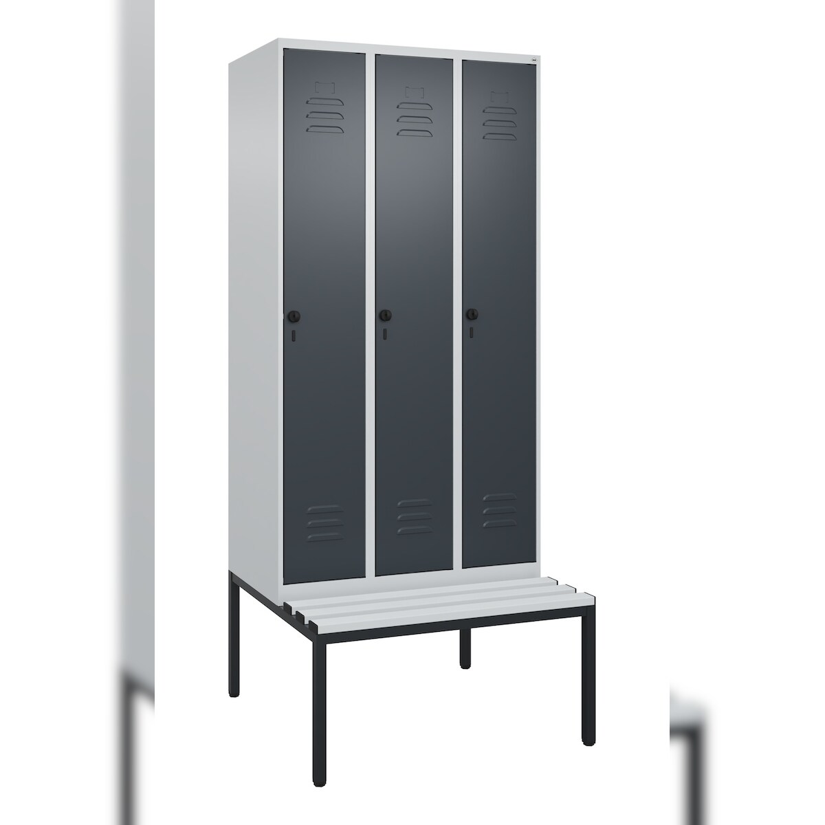 C+P Spind Classic PLUS, schwebender Sitzbank aus Buche 3 Abteile, HxBxT 212x120x82cm, Zylinderschloss, Hellgrau/Enzianblau von PROREGAL