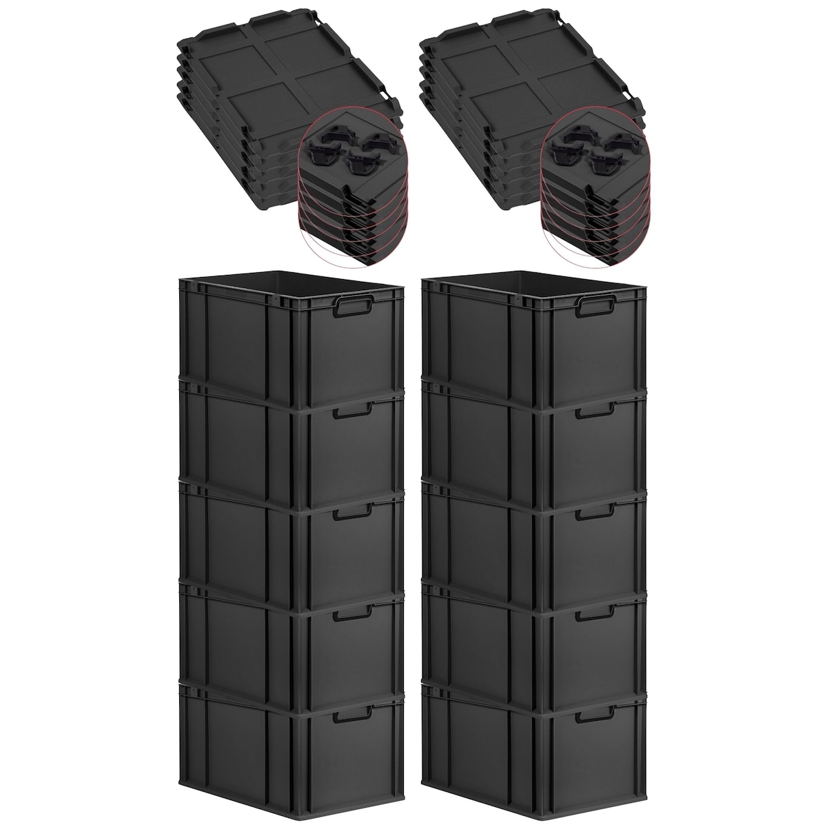PROREGAL SparSet 10x Eurobox NextGen Color mit Auflagedeckel & Verschlüsse, HxBxT 32x40x60cm, 65L, Schwarz, Griffe schwarz zu, Eurobehälter