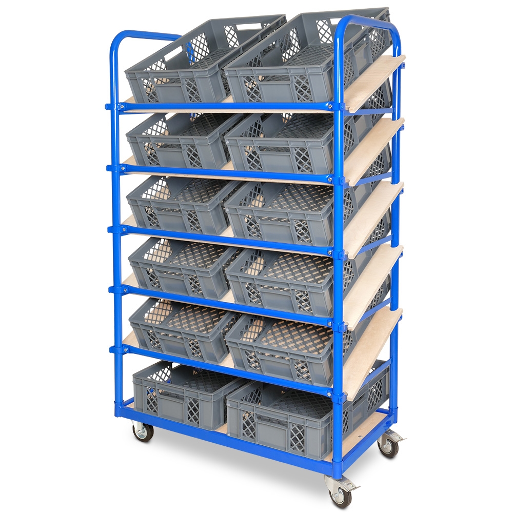 BRB Schrägboden-Regalwagen mit 6 Ebenen, BxTxH 1050x500x1690 mm, 2 Lenk- (mit Feststellbremse) u. 2 Bockrollen mit 12 Euroboxen BxTxH 600x400x150 mm