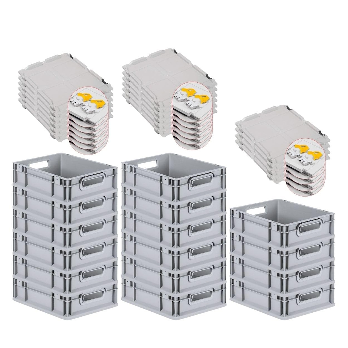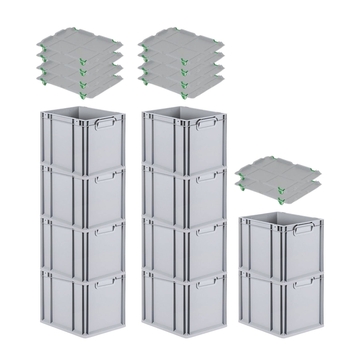 PROREGAL SuperSparSet 16x Eurobox NextGen Economy mit Auflagedeckel & 4x Verschlüsse Schwarz, Griffe offen, HxBxT 12x30x40cm, 11L, Eurobehälter, Box