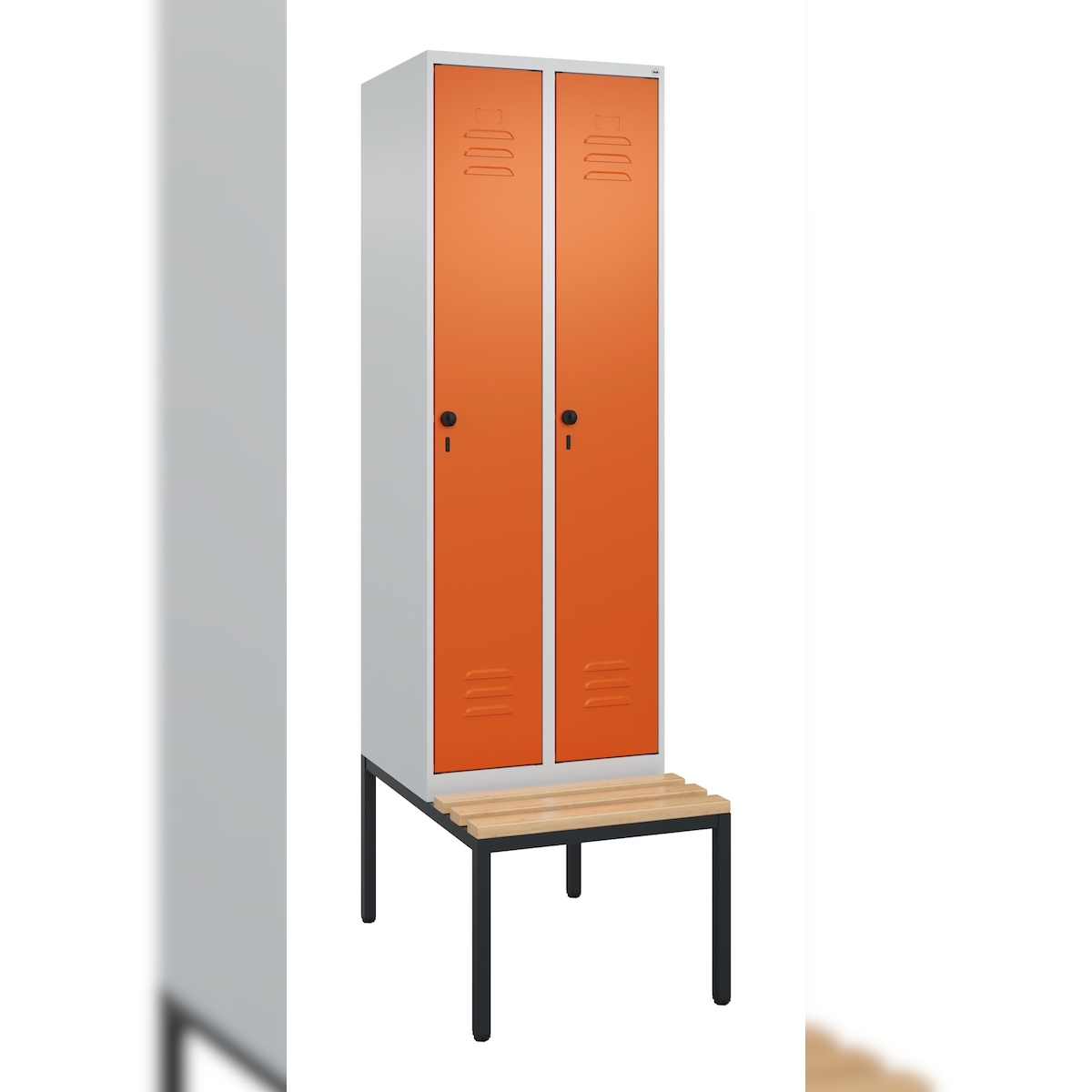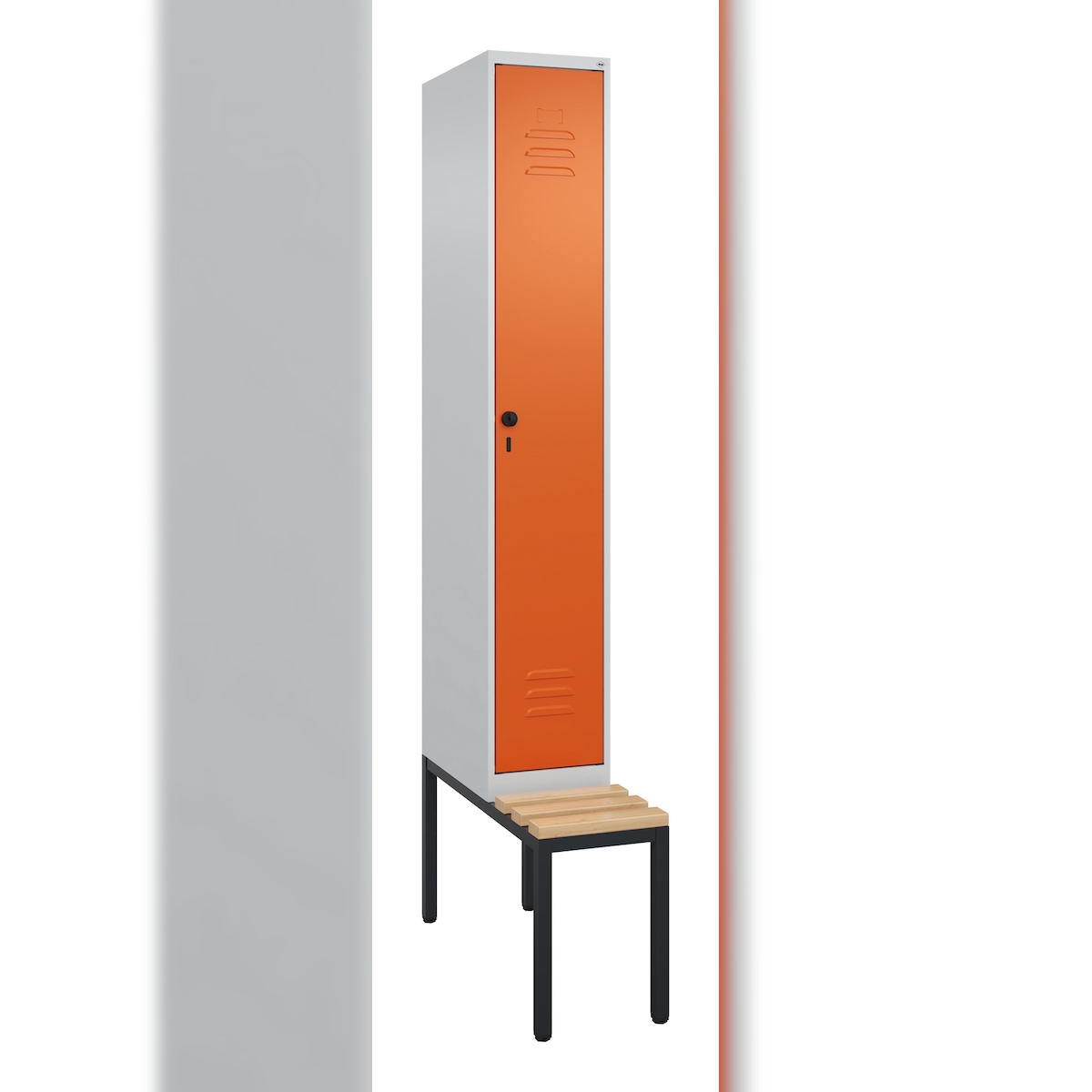 C+P Spind Classic PLUS, Buche untergebaute Sitzbank 1 Abteil, HxBxT 212x30x82cm, Sicherheitsdrehriegel, Hellgrau/Reinorange von PROREGAL