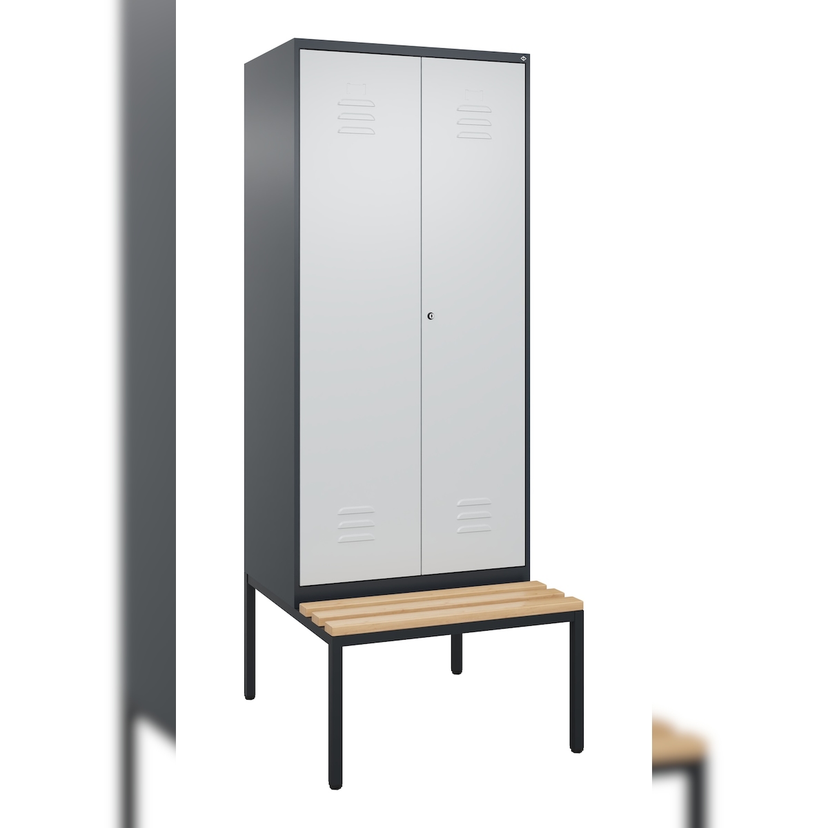 Schwarz-Weiß-Spind Classic PLUS Sitzbank, 1 Abteil, lichtgrau / resedagrün, B 600 mm, Sicherheits-Drehriegel, auskragend, Buche-Hartholz C+P