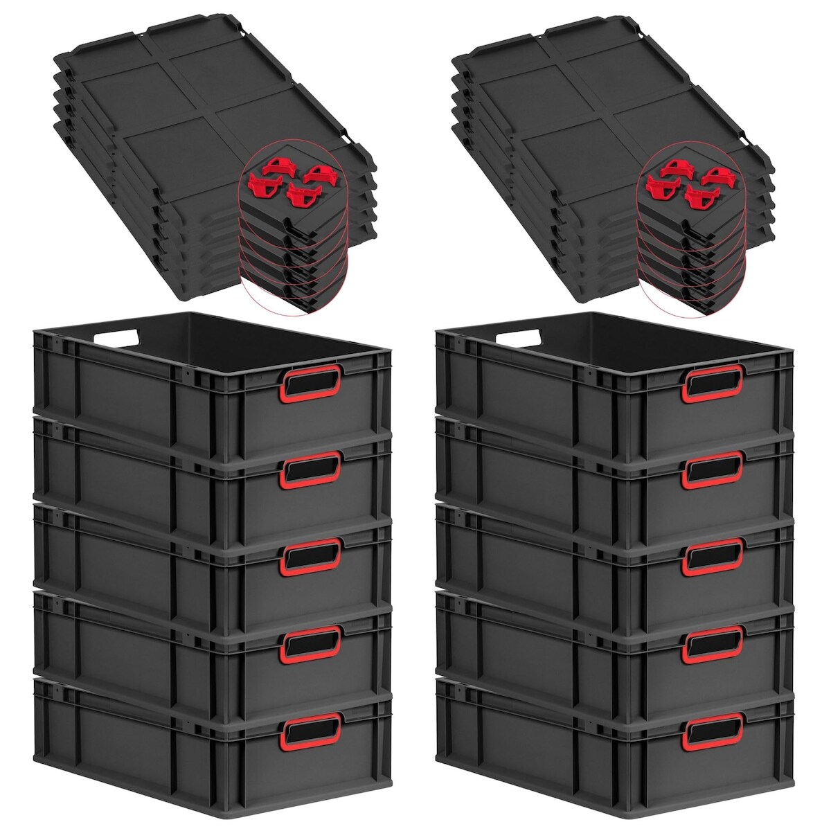 PROREGAL SparSet 10x Eurobox NextGen Grip mit Auflagedeckel & 4 blauen Verschlüssen, HxBxT 17x40x60cm, 34L, Schwarz, Griffe zu, Eurobehälter