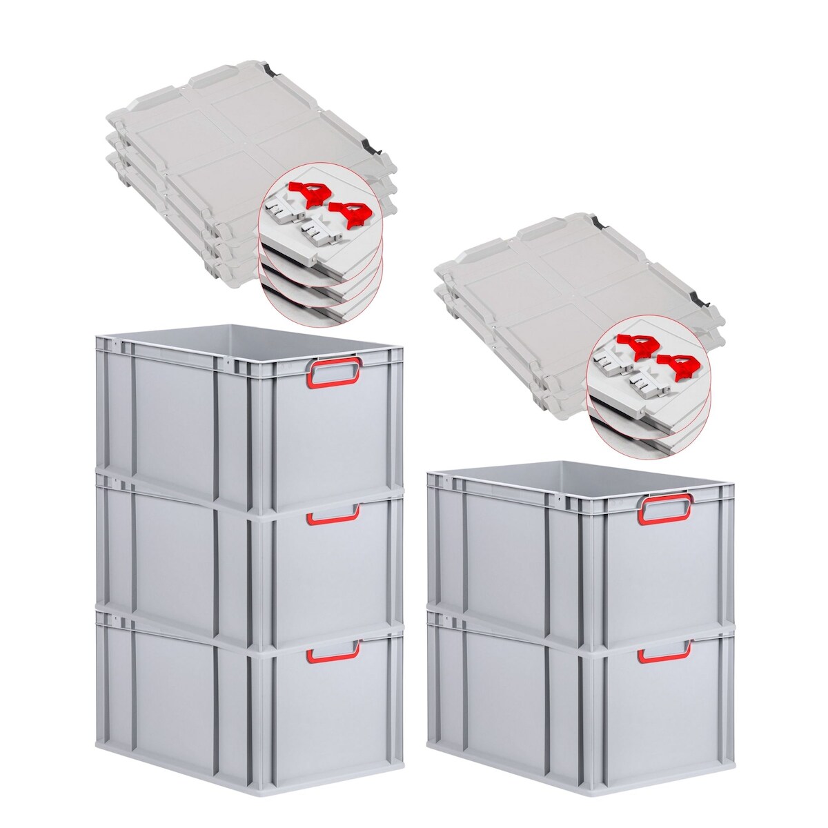PROREGAL 4x Eurobox NextGen Grip mit Scharnierdeckel & roten Verschlüssen | HxBxT 22x40x60cm | 44 Liter | Griffe geschlossen | Verstärkter Boden