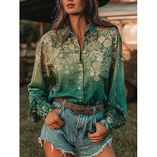 Per donna Camicia Blusa Floreale Grafico Vintage Casual Manica Lunga Colletto a Camicia Top Regolari Quotidiano Patchwork Bottoni Stampato Verde Beige Estate Primavera Autunno Inverno