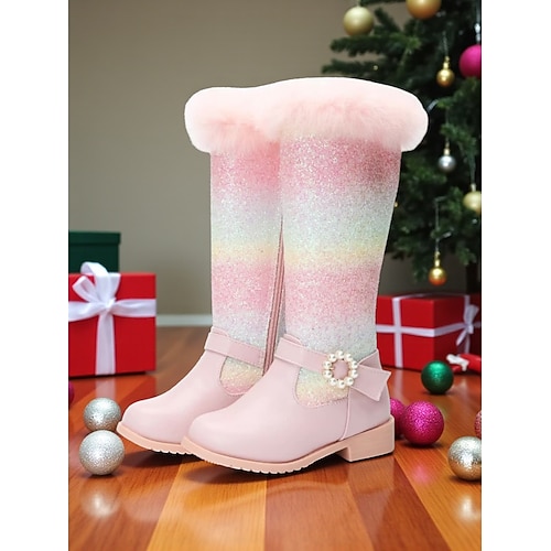 stivali alti fino al ginocchio da bambina con glitter arcobaleno, rifiniture in pelliccia sintetica e fibbia di perle - scarpe invernali scintillanti per feste e abiti da vacanza per bambini